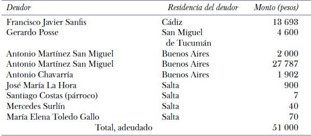 Decidido a asegurar su fortuna, el futuro y la posición de sus herederos en la comunidad salteña contemporánea, redactó su testamento en 1804 ante el escribano José Rodríguez. En este documento manifestó los saldos de sus deudores (véase cuadro 5). Reconoció, además como débitos incobrables aquellos préstamos que no fueron devueltos, los cuales adeudaban en su conjunto 2 610 pesos.