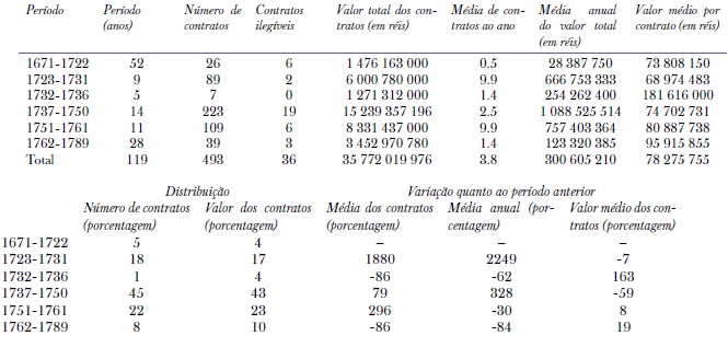 A distribuição dos contratos, tanto em seu número, quanto pelos valores acumulados, indica a concentração das arrematações entre 1737 e 1761, quando foram leiloados 67% dos contratos, o que representa 66% do valor total de todos os contratos arrematados entre 1671 e 1789. Também foram as épocas que indicaram a maior média anual quanto aos valores dos contratos. Em seguida, há o período de 1723 a 1731, quando foram vendidos 18% de todos os contratos (17% do valor total), além de ter sido o terceiro melhor desempenho da média anual do valor total dos contratos.