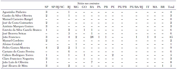 Após uma primeira listagem dos contratos arrematados no Conselho, a detecção da origem dos contratadores foi averiguada a partir das informações contidas nas inquirições dos processos de nobilitação para cavalheiro da Ordem de Cristo ou para familiar do Santo Ofício. Foram selecionados alguns arrematantes que participaram como sócios ou fiadores em dez ou mais contratos, incluindo necessariamente algum contrato paulista, ou que se destacaram pelo número de contratos relativos à capitania. Com base nestes critérios foram selecionados 17 contratadores (ver quadro 2). Uma vez que não foi possível verificar a origem e a trajetória de vida de todos os contratadores e fiadores envolvidos, os dados apresentados referem-se aos perfis mais completos.