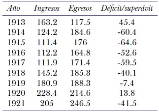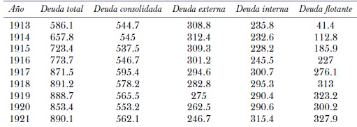 La deuda flotante entre 1913 y 1921 aumentó ocho veces. El aumento de la deuda a corto plazo en 1915 se debió, en parte, a la contratación de un préstamo por 50 000 000 de dólares, colocado a cinco años en Londres y Nueva York convirtiéndose en la mayor operación de su tipo durante el transcurso del conflicto bélico. La reducción en 1920 se debió al pago de dicho préstamo. Asimismo, la deuda externa consolidada desde el inicio de la guerra se reduce poco a poco, por las amortizaciones y la falta de nuevas emisiones, producto del cierre del mercado financiero europeo y de la incapacidad de acceder al mercado de Nueva York con préstamos a largo plazo (véase cuadro 2).