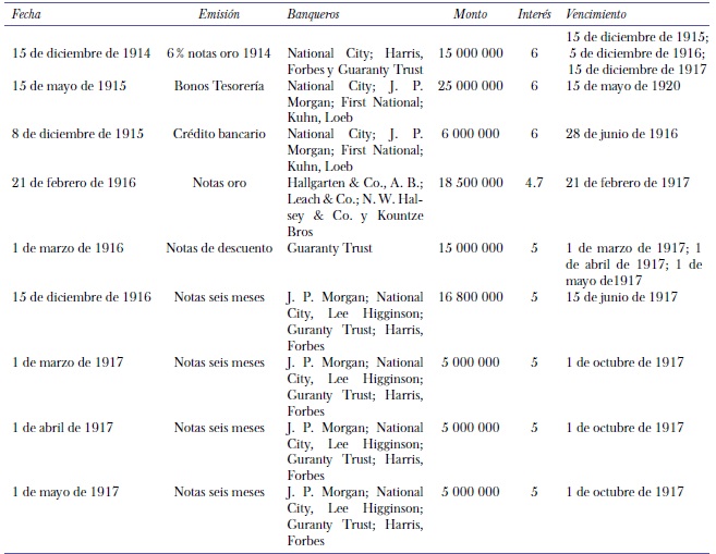A pesar de los ajustes realizados por el gobierno nacional se tuvieron que emitir en el primer trimestre de 1916 dos préstamos de corto plazo, uno por 18 500 000 dólares a través de Hallgarten & Co. a un año y otro por 15 000 000 de dólares con el Guaranty Trust Co. Este último, en tres series con vencimiento entre marzo y mayo de 1917. El National City Bank también ofreció al gobierno un préstamo por 15 000 000 que no fue considerado, probablemente porque sus condiciones fueran menos atractivas que los otros dos.18