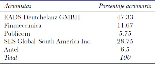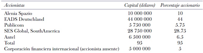 No obstante, durante el periodo del gobierno de transición no se logró estabilizar la situación crítica de Nahuelsat ni diseñar una solución para el Nahuel 2. En este punto, la ocupación de la posición de 81° O no estaba garantizada. En 2003, un informe elaborado por la Auditoría General de la Nación que intentaba clarificar el desempeño de Nahuelsat a cargo de la cnc y la Secom –en especial, en lo referido a las previsiones para ocupar la segunda posición orbital–, mostraba la composición accionaria de Nahuelsat (véase cuadro 1).