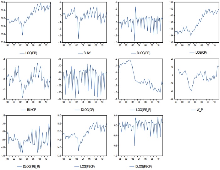 Para la estimación de los diferentes modelos se utilizaron el logaritmo natural del producto interno bruto (PIB), a precios constante de 1997, denotado por el LOG (PIB), la brecha del producto (BLNY) estimada a partir de la diferencia entre su nivel en logaritmo natural (en log), y su tendencia a largo plazo aproximada por el filtro Hodrick-Prescott (HP) como medidas de actividad económica[3], el logaritmo natural del gasto de consumo privado (LOGCP), a precios constantes de 1997, y la brecha del consumo privado (BLNCP) estimada a partir de la diferencia entre su nivel en log y su tendencia a largo plazo aproximada por el filtro HP, así mismo se utilizó el logaritmo natural de la formación bruta de capital fijo, a precios constantes de 1997, denotada por LOG(FBCF).
