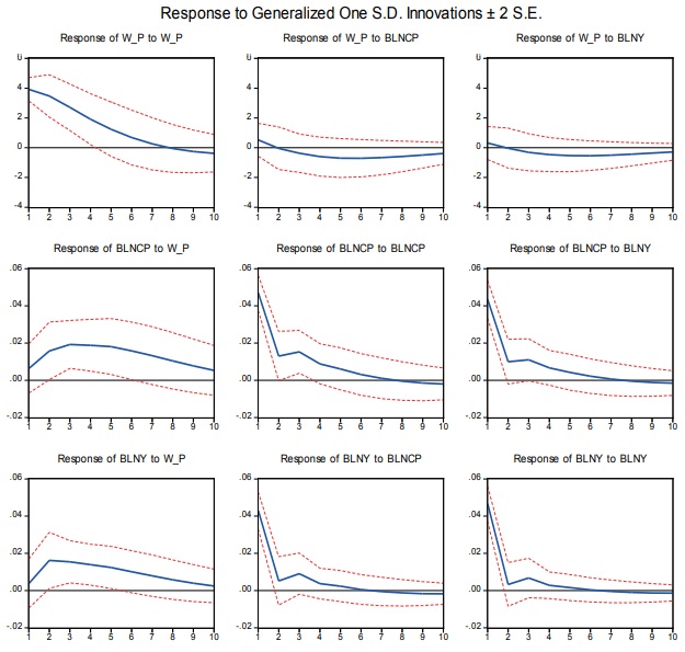 Del análisis de las funciones de impulso - respuesta generalizada (GIR) del modelo VAR7, se puede apreciar (en la columna 1, filas 2 y 3) que una perturbación (shock) equivalente a una desviación estándar de la variable que mide la variación del salario real (W_P), genera un impacto positivo pero de corta duración (de aproximadamente 3 a 4 trimestres) sobre la brecha del consumo y del producto agregado (corroborando los resultados de los modelos uniecuacionales anteriormente expuestos).