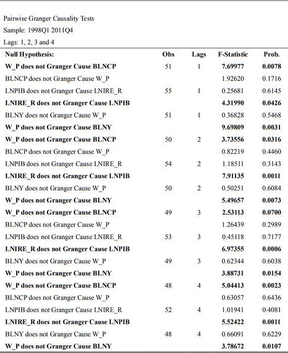 De forma complementaria en la Tabla VII se presentan las pruebas de causalidad de Granger (realizada de 1 a 4 rezagos), entre las variables que miden el salario real y su variación LOG (IRE_R) y W_P, respectivamente, y las variables dependientes (o regresadas) de los modelos anteriormente presentados, en las cuales se puede apreciar la dirección de causalidad, en el sentido de Granger, del salario real hacia el resto de las variables, lo cual aporta, en cierta forma, soporte estadístico a los resultados anteriores expuestos.
