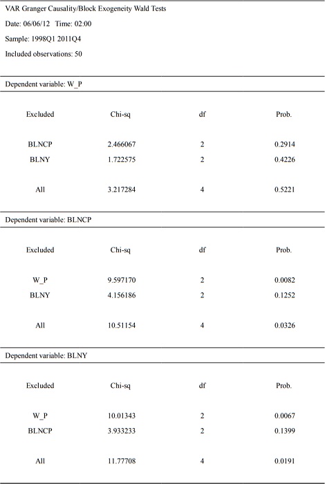 De tabla anterior se desprende, según la evidencia disponible, que de manera individual la variación del salario real (W_P) causa, en el sentido de Granger, a la brecha del consumo (BLNCP) y a la brecha del producto (BLNY), durante el período de estudio, lo cual se ha podido observar en estimaciones previas.