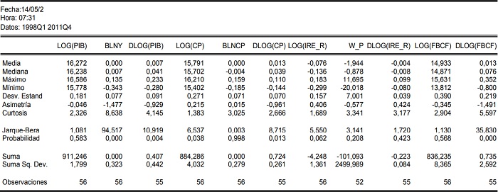 Como primera referencia, en tabla I se presenta el resumen de las principales estadísticas descriptivas de las variables que se utilizaron para este estudio, así como de algunas transformaciones a las mismas, con el objeto de caracterizar, en cierta forma desde el punto de vista estadístico, su comportamiento histórico durante el período (1998: I - 2011: IV).
