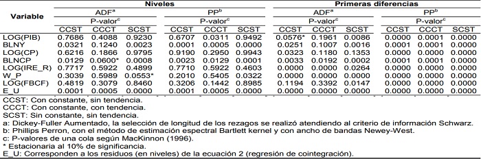 Adicionalmente, y como paso previo a las estimaciones, cada una de las variables (series) empleadas en las ecuaciones (modelos) de este trabajo fue analizada para determinar la presencia de raíces unitarias, dada la naturaleza de la metodología empleada. Los resultados de las pruebas de raíces unitarias expuestos en tabla II permiten visualizar el grado de integración de las variables, sobre la base de distintas especificaciones, según las pruebas convencionales de Dickey-Fuller Aumentado (ADF) y Phillips-Perron (PP) durante el período de estudio.