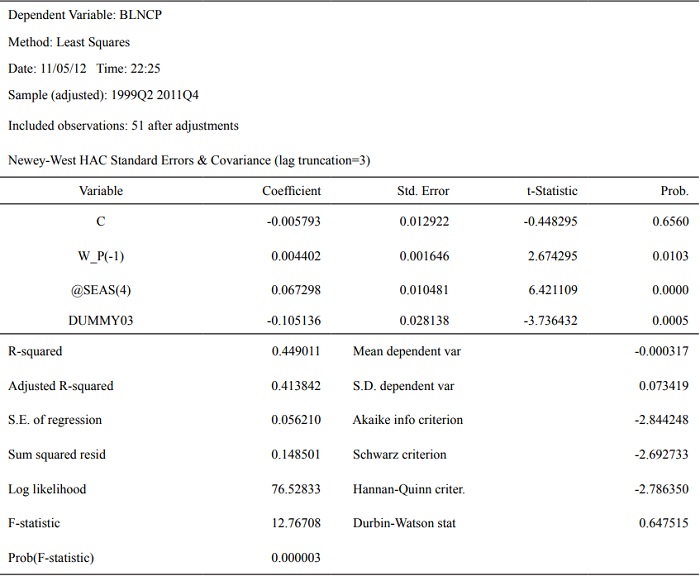 Para analizar la relación o los efectos de las variaciones del salario real sobre las fluctuaciones económicas, tal como se mencionó anteriormente, se utilizaron dos tipos de alternativas de modelación, a saber, modelos uniecuacionales y un modelo multiecuacional (VAR); para los primeros, se utilizó un enfoque similar al empleado en Pozo (2008), se estimó primeramente una ecuación en donde se relaciona la brecha del gasto de consumo privado (BLNCP) con la variación anualizada del salario real (W_P), pues considero que son medidas más apropiadas (o aproximadas) para representar las fluctuaciones de corto plazo del gasto de consumo privado y las variaciones del salario real, respectivamente, que al utilizar sus niveles en esta ecuación se persigue obtener, en cierta forma y atendiendo a las limitaciones del análisis, evidencia sobre la incidencia de las variaciones del salario real (enfoque de ingreso) sobre las fluctuaciones del consumo privado durante el período de estudio.