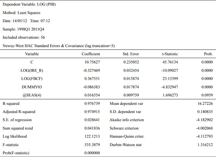 En este modelo, la evidencia disponible sugiere, durante el período de estudio, que el nivel del salario real (en log) tiene una relación inversa, ceteris paribus, y estadísticamente significativa con respecto al nivel del producto (en log) de la economía, mientras que la FBCF (en log) presenta una relación directa (positiva) con respecto al producto, manteniendo los demás factores constantes, tal como es de esperarse a priori (Pozo, 2008).