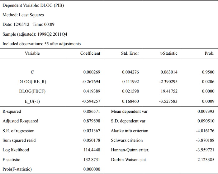 En el tabla II se puede apreciar que los residuos (E_U) de esta regresión resultaron estacionarios en niveles según las pruebas ADF y PP, por lo que según el procedimiento de Engle - Granger (1987) no se descarta una relación de cointegración, en consecuencia, se procedió a estimar un modelo de corrección de errores (MCE) (ver tabla V: modelo 3) que refleje el ajuste (velocidad de convergencia) de corto plazo hacia el equilibrio de largo plazo.