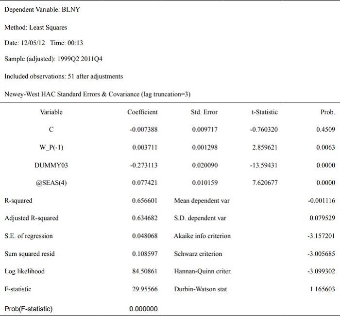 Posteriormente, se estima una regresión que relaciona la brecha del producto (BLNY) como medida aproximada de las fluctuaciones de corto plazo de la actividad económica con la variación anualizada (puntual) del salario real (W_P), similar a la primera ecuación referente a la brecha del consumo, para conocer, en cierta forma y según la evidencia disponible, como se relaciona las variaciones del salario real con las fluctuaciones de la actividad económica.
