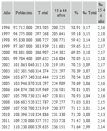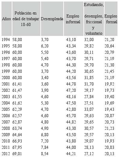 Por otro lado, según se desprende de la Tabla IV, en las últimas décadas ha aumentado tanto la tasa de desempleo (del 3,7% en 1994 al 8,44% en 2012) como la tasa de empleo informal (del 43,10% en 1994 al 44,21% en 2012); en detrimento de la tasa de empleo formal, la cual ha decrecido del 21,20% en 1994 al 20,13% en 2012. En este sentido, podría afirmarse que el período de aplicación de políticas liberales coincide con un empeoramiento de las condiciones del mercado de trabajo del país.