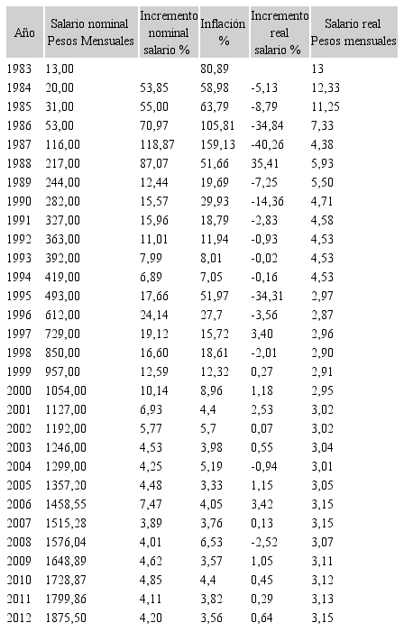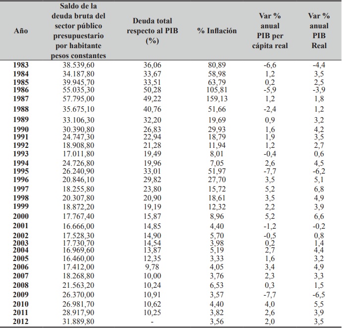 Tal y como se recoge en la tabla I, mientras que el saldo de la deuda bruta del sector público por habitante bajó de 38.539,6 Pesos en 1983 a 31.889,8 en 2012, la inflación lo hizo de niveles del 80% al 4% anual, lo cual viene a demostrar cómo las medidas de política macroeconómica restrictivas, tanto fiscal como monetaria, tomadas en estas tres últimas décadas, llevaron a cumplir esos objetivos económicos intermedios.