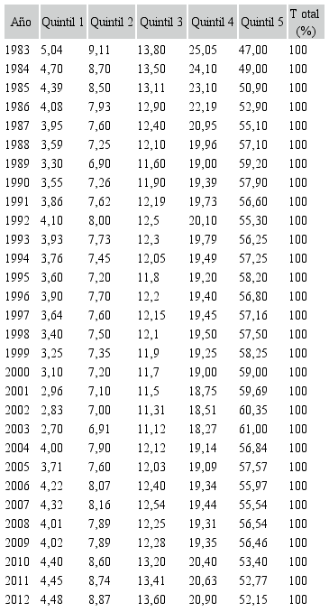 Así, por ejemplo, según la tabla referida, en el año 2005 solo el 3,71% de la riqueza fue para el quintil 1 de la población, mientras que el más rico (quintil 5) se quedó con el 57,6% de la riqueza nacional. Esta polarización de la riqueza se ha incrementado en los años de aplicación de políticas liberales, ya que, mientras que en 1983 el quintil más rico se apropiaba del 47% de la riqueza nacional, y el más pobre del 5,04%; en 2012 el quintil más rico ya se apropiaba del 52,15%, mientras que el más pobre sólo lo hacía del 4,48%. En este mismo sentido, también manifiesta Aguilar Gutiérrez (2013) al analizar el índice de polarización del ingreso de México para el período 1984-2010.