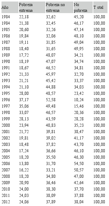 Por consiguiente, como consecuencia de esa débil creación de riqueza y de la mala distribución de la misma, tal y como se recoge en la tabla III, los niveles de pobreza del país han aumentado en estas tres últimas décadas. Así, mientras que en 1983 el 45,20% de la población del país estaba fuera de los niveles de pobreza, en 2012 sólo el 38,04% se encontraba fuera de esta situación. Sin embargo, el porcentaje de población en extrema pobreza ha subido, pasando del 22,18% en 1983 a 24,06% en 2012.