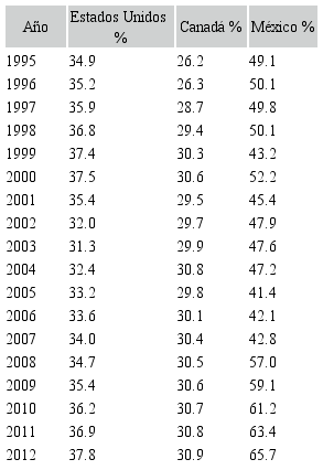 Tal y como se recoge en la Tabla V, también cabe destacar el importante desempleo que existe entre la población joven mexicana en edad de trabajar, sobre todo si se compara con Estados Unidos y Canadá, países miembros del Tratado de Libre Comercio con América del Norte T.L.C.A.N. Esta tasa también ha ido creciendo en las últimas décadas, pasando del 49,1% en 1995 al 65,7% en 2012. Para el caso mexicano, este crecimiento ha sido mayor que en los dos países con los que se compara.