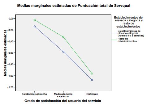 Respecto al comportamiento de las puntuaciones de SERVQUAL en los diversos grupos de alojamiento, las puntuaciones medias se muestran inferiores para los establecimientos de elevada categoría, que la del resto de establecimientos, tal comportamiento se repite (es igual o similar) dentro de los grupos de usuarios totalmente y moderadamente satisfechos e indiferentes, dado que no existe interacción entre ambos factores (Gráfico I).