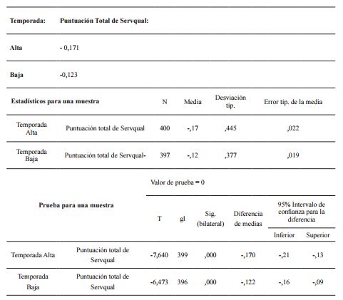 La calidad del servicio medida a través de la puntuación total de SERVQUAL, para las temporadas alta y baja, es negativo pero muy cercano a cero (Tabla II), por cuanto el nivel de expectativas superó ligeramente el nivel de percepciones, indicando un leve déficit en la calidad del servicio. Para inferir los anteriores resultados, a todos los elementos de la población, se practicó una prueba T para una muestra para conocer si el valor promedio de la puntuación total de SERVQUAL es igual a cero (contraste bilateral).