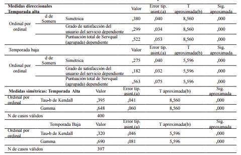 Para medir la relación entre ambas variables, en ambas temporadas de turismo, se utilizaron los coeficientes d de Somers, Tau-b de Kendall y Gamma, como coeficientes de correlación para variables ordinales. Al observar el valor crítico de los coeficientes (sig aproximada < 0,05), se rechaza la hipótesis nula de la prueba que plantea la independencia entre ambas variables, por lo que se infiere con un 95% de confiabilidad que existe una relación de dependencia entre el nivel de satisfacción del usuario y las puntuaciones totales de SERVQUAL (Tabla IV).