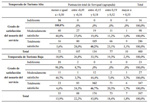 Dado que el valor de cada uno de los coeficientes utilizados en la prueba son positivos se puede inferir además la dirección de la relación evidenciada, donde a mayor nivel de satisfacción del usuario mayor es la puntuación total de SERVQUAL. Adicionalmente la tabla de contingencia construida para cada temporada de turismo destaca que la mayor cantidad de usuarios que se manifiestan totalmente satisfechos (más del 40% de los encuestados) presentan puntuaciones de SERVQUAL cercanas a cero (entorno a -0,15 y 0,18 puntos) (Tabla V).