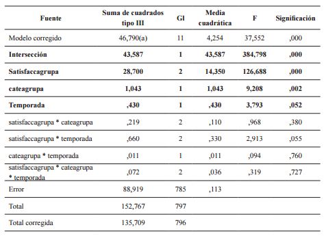 De acuerdo a los resultados del ANOVA factorial practicado (Tabla VII), el nivel crítico del estadístico F (p = 0 < 0,05) indica que el modelo explica una parte significativa de la variación observada en las puntuaciones de SERVQUAL (variable independiente), que no existen diferencias en cuanto a la puntuaciones totales de SERVQUAL durante las distintas temporadas de turismo (alta y baja); y que sólo los grupos de usuarios definidos por las variables satisfacción, y categoría del establecimiento presentan puntuaciones totales de SERVQUAL diferentes.