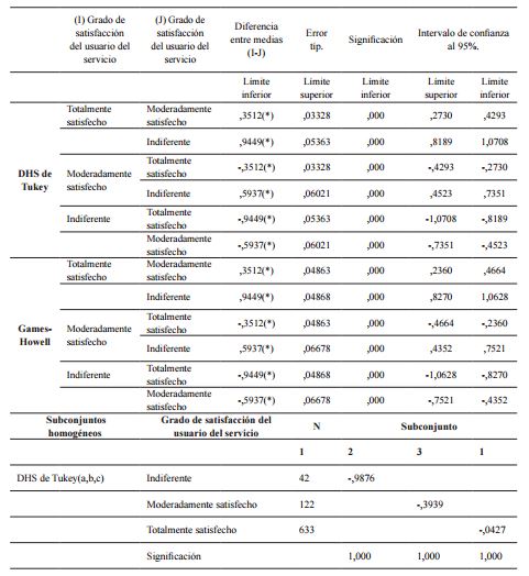 Además implica que en la satisfacción del usuario existen otros factores además de la calidad del servicio que pudieran haber incidido en sus elevados niveles, es decir, factores en este caso capaces de atenuar los moderados o escasos niveles de calidad del servicio indicados por los usuarios, tales como la categoría del establecimiento, según lo demostró su interacción en el ANOVA factorial practicado. La anterior participación y complejidad ha sido señalada por numerosos autores como Lovelock et al. (2010), Kotler y Armstrong (2013), Gonzales y Brea (2006) y Oh (1999), los cuales plantean que las relaciones entre ambos no son claras, y que la satisfacción del usuario depende de múltiple factores, incluidos la calidad y el valor las cuales pueden influir en la percepción de satisfacción.