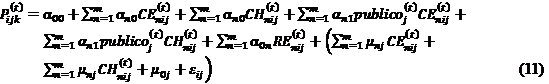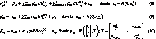 Por lo anterior, y con el ánimo de determinar si las desigualdades educativas, causadas por la titularidad del centro escolar, influyen en la adquisición de competencias, se incluirá en el macro-nivel, un efecto aleatorio en cada bnj, además de la variable público. De esta manera, el MNP en el micro-nivel y macro-nivel se reescribe como: