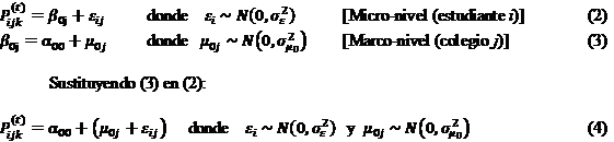 De presentarse dicha significancia, al MN se le incorporan predictores en el micro-nivel y el macro-nivel; es decir, se introducen los inputs individuales en (2) y los escolares en (3), tal y como lo realizan Sun, et al. (2012). Así, el micro-nivel y el macro-nivel quedan expresados en (5) y (6):