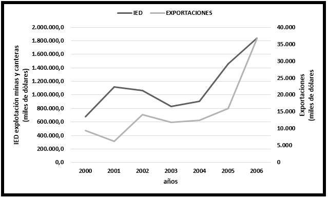De acuerdo a cifras del Banco Central del Ecuador (2007), la IED en explotación de minas y canteras, al igual que las exportaciones, durante el periodo 2000-2006, presentaron una tendencia de crecimiento que podría explicarse como producto de la recuperación del dinamismo económico de este sector a nivel mundial (Figura III). Sin embargo, cabe precisar que debido a la supresión de las regalías, los créditos obtenidos beneficiaron mayoritariamente a las compañías privadas extranjeras.