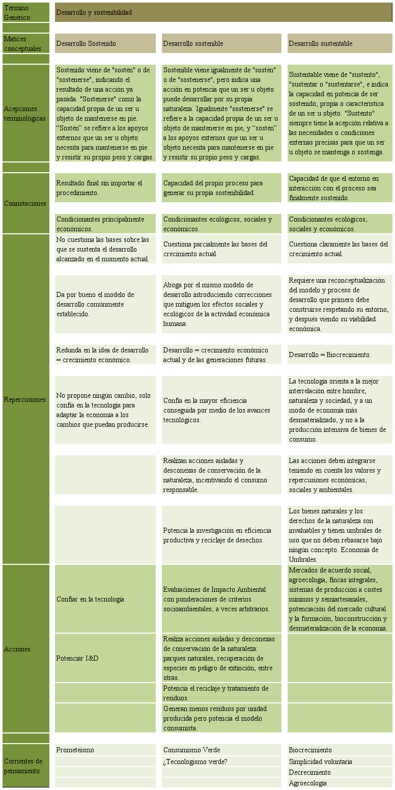 En primer lugar, se consideran tres derivas conceptuales relacionadas con el adjetivo con el que se acompaña la palabra desarrollo: desarrollo sostenible, sustentable o sostenido. “Sostenido” hace referencia a su mantenimiento; “sostenible” a que tiene la capacidad, potencialidad real de mantenerse en el tiempo; y, “sustentable” a que es capaz de ser mantenido, “sostenido”, no solo por si mismo sino también por el entorno en el que, o para el que, se produce el desarrollo. Cada uno de estos matices o acepciones han generado distintas visiones del concepto, que se pueden apreciar en el Cuadro I.