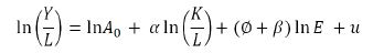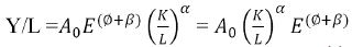 (2)Donde A0 representa el factor exógeno, en tanto que el componente endógeno depende del capital humano que a su vez se expresa como la interacción entre el trabajo (L) y el promedio de años de escolaridad (E). Ø representa la sensibilidad de la productividad con respecto al nivel educativo.