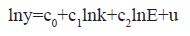 Al ajustar nuevamente mediante MCO el modelo (7) adicionándole las dos variables dummy, es decir, al modelo lny=c0+c1lnk+c2lnE+c3D1+c4D2+u, resulta nuevamente que tanto el modelo en general como todos los estimadores considerados de manera individual son estadísticamente significativos al 95% de confianza por cuanto las probabilidades de los estadísticos F y t son inferiores al 5% (0,05) respectivamente; al tiempo que el Durbin Watson aumentó su valor con respecto al inicialmente obtenido, ubicándose en 1,125 (Tabla V).