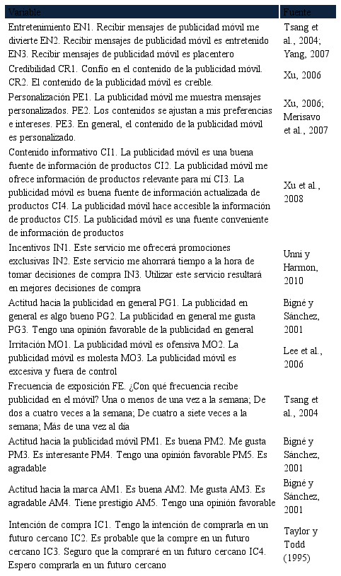 Para conseguir este objetivo, el trabajo se estructura en dos partes. Una primera parte, de contenido teórico, y una segunda parte, en la que a través de un estudio empírico, utilizando una muestra de 208 usuarios de móvil españoles que han recibido alguna comunicación de publicidad móvil, se examina la incidencia de distintas variables controlables y no controlables por el anunciante en la decisión de comprar las marcas anunciadas mediante publicidad móvil en el futuro. Para ello, y mediante cuestionario estructurado, se recoge información que posteriormente es analizada mediante sistemas de ecuaciones estructurales que permiten el contraste de las hipótesis planteadas (Tabla I).