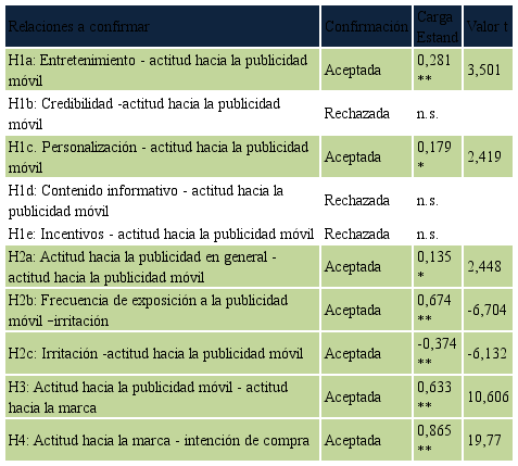 Con relación al cumplimiento de las hipótesis relativas a los antecedentes de la actitud hacia la publicidad móvil, es de destacar que la actitud hacia la publicidad en general (H2a aceptada), el entretenimiento (H1a aceptada) y la personalización (H1c aceptada), influyen positivamente en la actitud hacia la publicidad móvil mientras que la irritación (H2c) lo hace negativamente, cumpliéndose las relaciones planteadas.