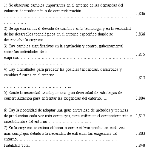 En este trabajo se ha podido elaborar una escala útil compuesta por siete ítems (multi-ítems) para medir la percepción de los gerentes y directivos sobre las características del entorno (estable/sencillo y dinámico/complejo) de medianas empresas del estado Lara, Venezuela. Asimismo, pudo comprobarse que la escala posee propiedades psicométricas adecuadas (fiabilidad y validez de constructo) que la convierten, por tanto, en una referencia significativa para futuras investigaciones de carácter empírico y con propósitos similares.