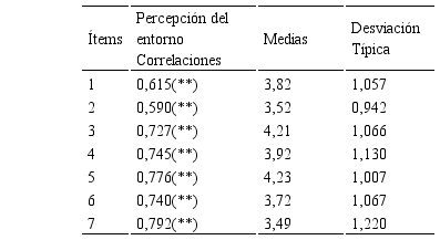 El primer procedimiento fue llevado a cabo a través de un análisis de correlaciones de Pearson entre los ítems de las escalas que miden la percepción del entorno y la media total de la variable latente que evalúan. En la Tabla II, los resultados de esta prueba.