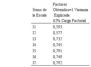 El análisis factorial extrajo un sólo componente donde se agrupan todos los ítems, es decir, convergen todas las cargas factoriales hacia un solo factor. En este caso, en la única variable latente que hay que medir: percepción del entorno, y que era lo esperado inicialmente desde el punto de vista teórico. Además, el análisis factorial consigue explicar el 62% de la varianza total de los datos, condición adecuada puesto que en el campo de las ciencias sociales es considerado razonable si los componentes extraídos la explican en al menos un 60% (Uriel y Aldás, 2005).