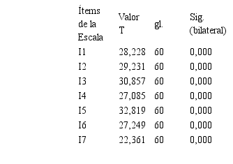 Para verificar la hipótesis referida a la existencia de diferencias significativas entre los valores de las medias de los ítems de la escala de medición, se aplicó una prueba T de muestras relacionadas. Desde el punto de vista estadístico es idéntica a la de una muestra, su diferencia fundamental radica que en la primera las puntaciones de la muestra se obtienen a partir de la cuantificación de una sola variable, mientras que con la de muestras relacionadas dichas puntaciones provienen de diferentes variables (Pardo y Ruíz, 2005), tal como corresponde en este caso. Los resultados en la tabla IV.