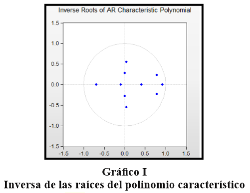Los resultados, además, también son respaldados por el test ADF. Al seguir todas las variables procesos I(1), para estacionarizarlas, se introducen en primeras diferencias. Tras introducir en primeras diferencias todas las variables, se comprueba que no se ha pasado por alto ninguna raíz unitaria mediante la inversa de las raíces del polinomio característico del modelo de vectores autorregresivos. El Gráfico I muestra que ningún valor queda fuera del círculo, por lo que el modelo en su conjunto es estacionario. Esta prueba indica que el modelo VAR es estable.