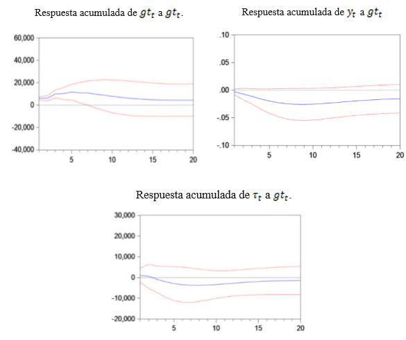Para mostrar los efectos de largo plazo, se muestran las FIR acumuladas. Los resultados encontrados son idénticos a los del análisis de descomposición de la varianza del error de predicción, no obstante, se encuentra un resultado que llama la atención sobre el impacto del incremento del tamaño del sector público sobre el nivel de producción real de la economía.