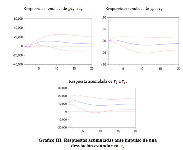 Se puede observar en el Gráfico II cómo impulsos en el nivel de gasto tienen un impacto negativo reducido sobre el nivel de recaudación pasados unos periodos; mientras que, impulsos en el nivel de recaudación impositiva conllevan incrementos en el nivel de gasto público, apreciables en el Gráfico III.