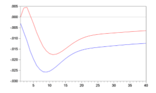 Llama la atención el resultado de un impulso en el gasto público o en la recaudación impositiva sobre el producto real, ambos impulsos le afectan negativamente. Para una mejor visualización se aporta el Gráfico IV donde aparece la respuesta del producto real ante ambos impulsos.