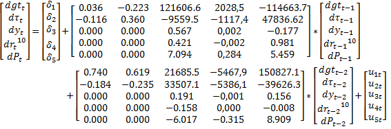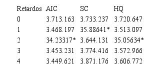 Teniendo en cuenta las limitaciones de los contrastes bayesianos, como que AIC tiende a sobreestimar el número de retardos a incluir o los criterios BIC(SC) y HQ funcionan mejor en muestras grandes, con los resultados presentados en la Tabla III, se decide incluir 2 retardos, quedando así el modelo en su forma reducida: