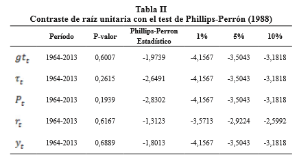 Primeramente se hace uso del test de Phillips-Perrón (1988) para comprobar si las variables son integradas de orden uno, es decir, I(1) y estacionarizarlas. Los resultados se muestran en la Tabla II.