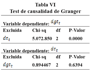 El objetivo de esta sección es el de establecer la precedencia temporal entre ingresos y gastos públicos, para ello se realiza un test de causalidad de Granger (1969) en el modelo VAR especificado anteriormente. El modelo es el siguiente