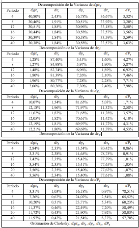 Para aportar mayor respaldo al análisis de la causalidad en el sentido de Granger se procede a la descomposición de la varianza del error de predicción, ya que en sí, el análisis de causalidad de Granger no indica una causalidad económica.