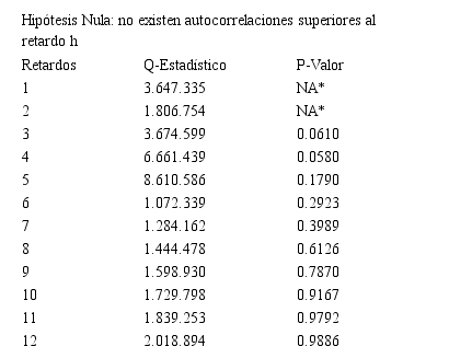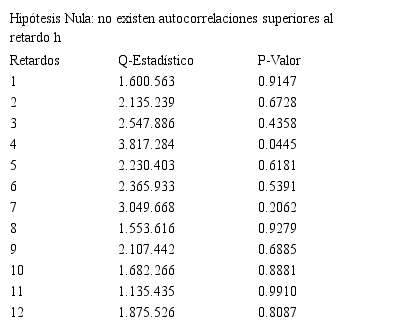 a) Contraste de Portmanteau: Este contraste, estudia la correlación de los residuos como vector en lugar de las autocorrelaciones de cada uno de sus elementos (Tabla IV).