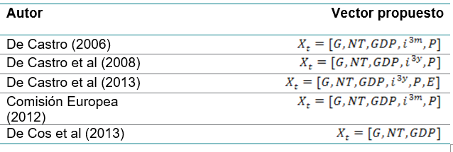 En la literatura se han planteado distintas combinaciones de variables a incluir en los modelos VAR para estudiar el efecto de la política fiscal, entre ellos cabe destacar los recogidos en la siguiente tabla.