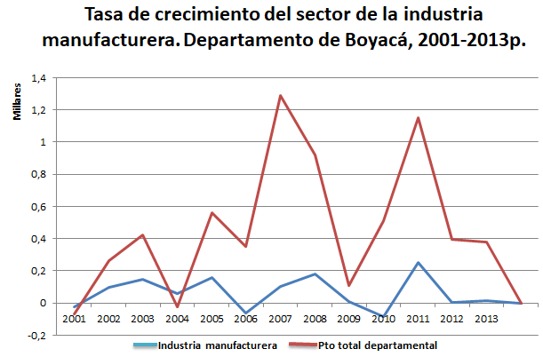 Según los informes Balance 2014 y Perspectivas 2015 brindados por la Asociación Nacional de Industriales (ANDI, 2014), en el caso particular de Colombia, la industria manufacturera continúa rezagada frente a otras actividades y frente al PIB total, participando con el 12,2% del PIB total. En efecto, mientras el crecimiento promedio del PIB entre 2000 y 2014 fue 4,2% anual, el PIB industrial apenas creció 0,2%. En 2014 no se logra revertir esta tendencia y la industria sigue creciendo 4,5 puntos por debajo del PIB. Sin embargo, según datos del Informe Boyacá en Cifras 2015 (Gobernación de Boyacá, 2015), el comportamiento de la industria manufacturera ha mantenido su crecimiento y muestra una tendencia muy similar al PIB de Boyacá, su producción en el período 2011-2013 no presentó incrementos significativos. Para los años 2001, 2006 y 2010, se generaron tasas de incremento negativas correspondientes al -2,9%; el 5,1% y el 5,5% respectivamente. Concluyendo, el año 2011 se posicionó como el de mayor nivel de crecimiento, con una tasa de 17,6% (ver Figura II).